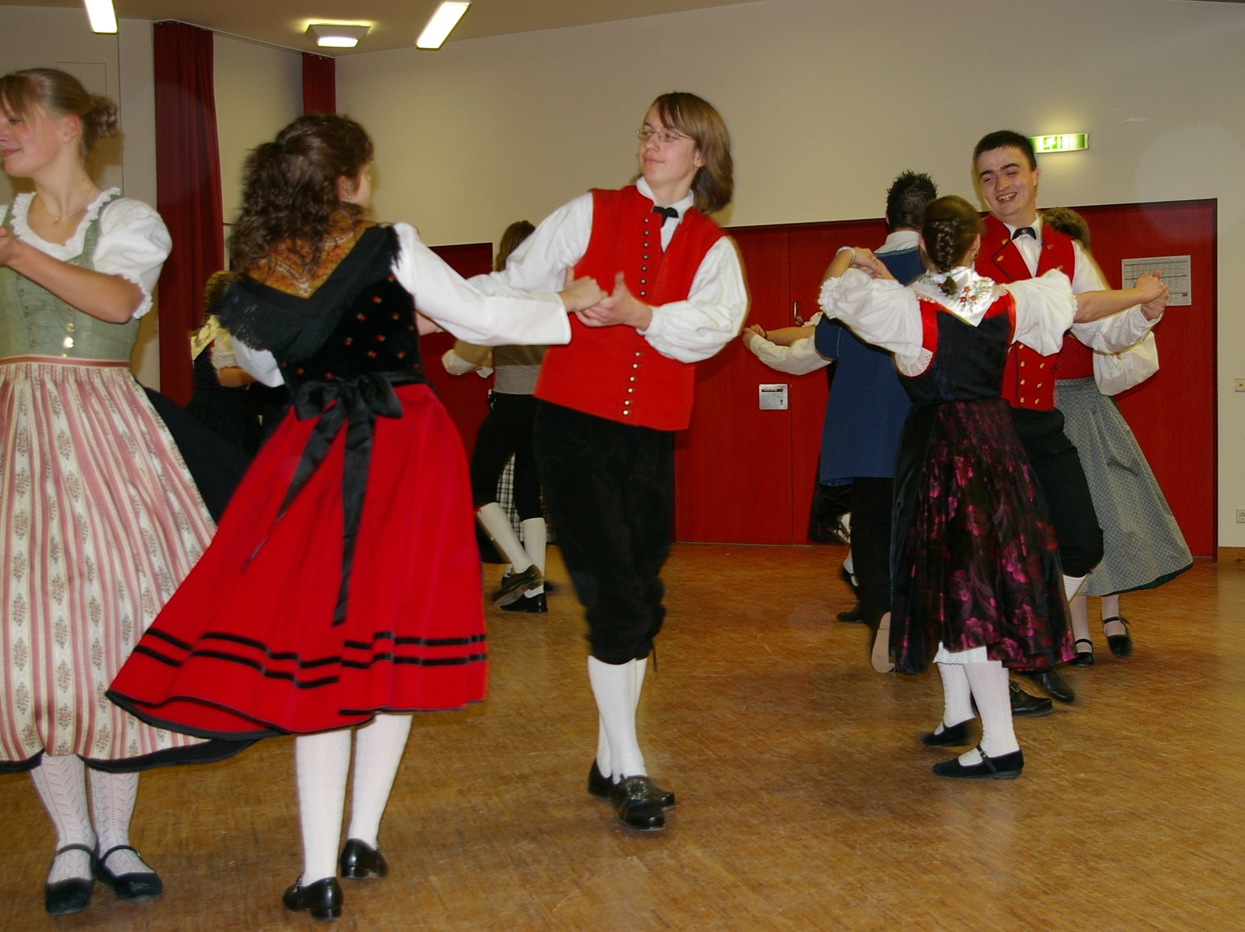 Durch Angebote von "Offenen Volkstanzveranstaltungen", bei denen auch ungeübte leicht mittanzen können, fördern wir das gemeinsame Tanzen.