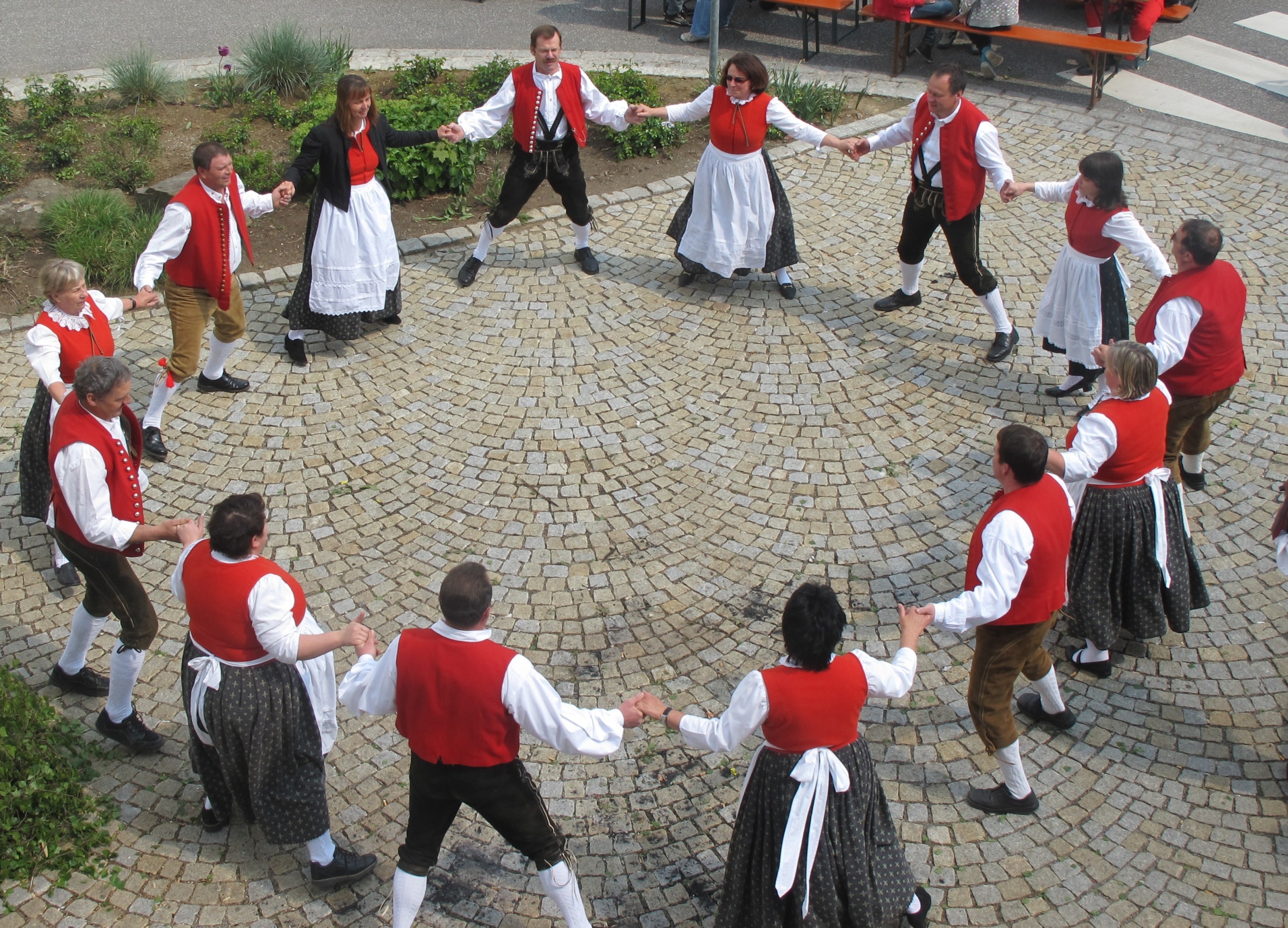 Durch Angebote von "Offenen Volkstanzveranstaltungen", bei denen auch ungeübte leicht mittanzen können, fördern wir das gemeinsame Tanzen.